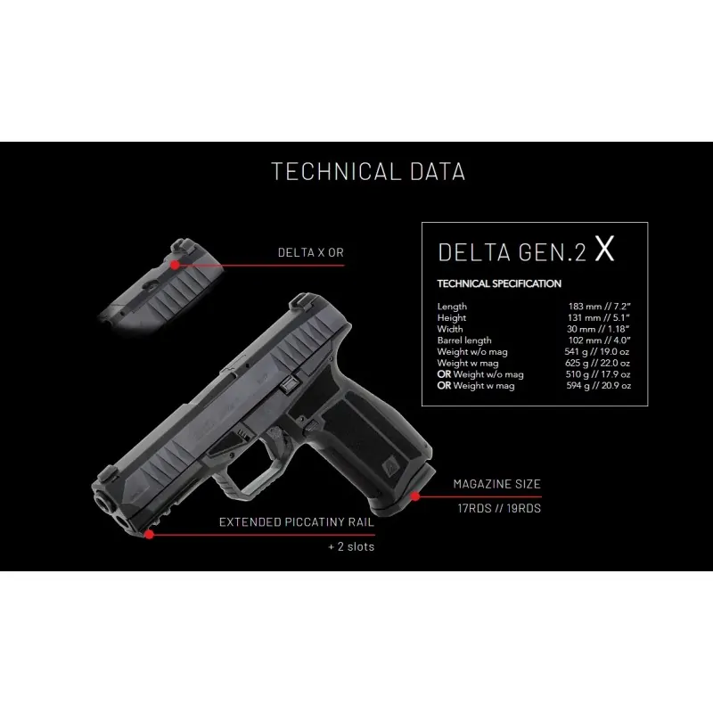 Pakirano v kovčku, v kompletu 2 magazina, dodatne 3 izmenljive nastavke za prilagajanje širine ročaja